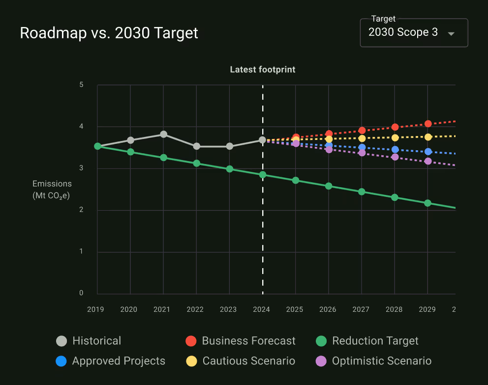 Visualize your targets and initiatives in one place, built for enterprise-scale reduction. Modelize different scenarios to meet your targets.